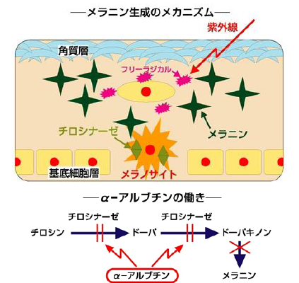 メラニン生成の抑制・・・α-アルブチンや植物プラセンタがメラニンを強力に抑制