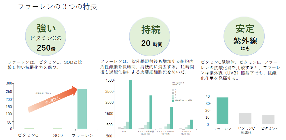 酸化ストレスによって引き起こされるとされている肌トラブルは多いため強く安定した抗酸化力を持つフラーレンは効果的に美肌に導きます。